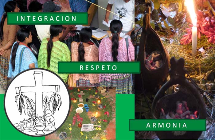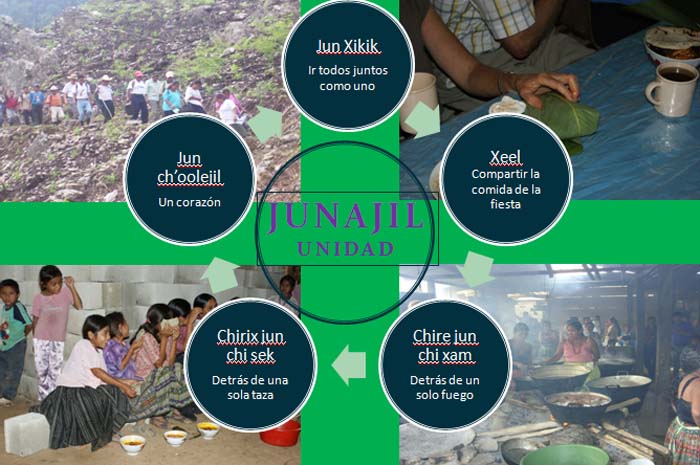 Die ersten grossen Prinzipien der Kosmovision der Maya-Q'eqchi' sind Integration und Harmonie. Alles Existierende findet seinen Platz in einer integrierten Einheit in Harmonie. Alles hat seinen Platz, seinen Grund und seine Funkion im Kosmos. Jeder Gegenstand und jedes Lebewesen hat seine Existenzberechtigung. Aber die Dinge und Menschen sind nicht getrennt, sondern "jedes für sich gemeinsam". Alles ist gut, aber in Einheit. Wesentich ist immer nach Harmonie zu streben. Es existieren viele Ausdrücke und Bräuche die von dieser Einheit Zeugnis ablegen: jun xikik (ein einziges gehen: alle zusammen); chire jun chi sek (hinter einer Tasse: alle zusammen), chire jun chi xam (hinter einem Feuer: alle zusamme), xeel (Brauch nach einem Fest etwas vom Essen nach hause zu bringen für die, die nicht teilnehmen konnten etc.) Die Einheit der Überzeugungen und Herzen (junajil) ist für das Verständnis des Zusammenlebens und bei religiösen Feiern und Ritualen für die Q'eqchi' sehr wichtig. Dies kommt auch in der Form der Entscheidungsfindungsprozesse im kollektiv zum Ausdruck. Im Allgemeinen werden Situationen und Probleme so lange diskutiert, bis ein Konsens gefunden worden ist und alle sich mit der getroffenen Entscheidung abfinden können. Dieses Vorgehen unterscheidet sich sehr von der westlichen Form der Demokratie. In der Demokratie wird die Meinung der Mehrheit immer über die Interessen von Minderheiten oder Individuen gestellt.