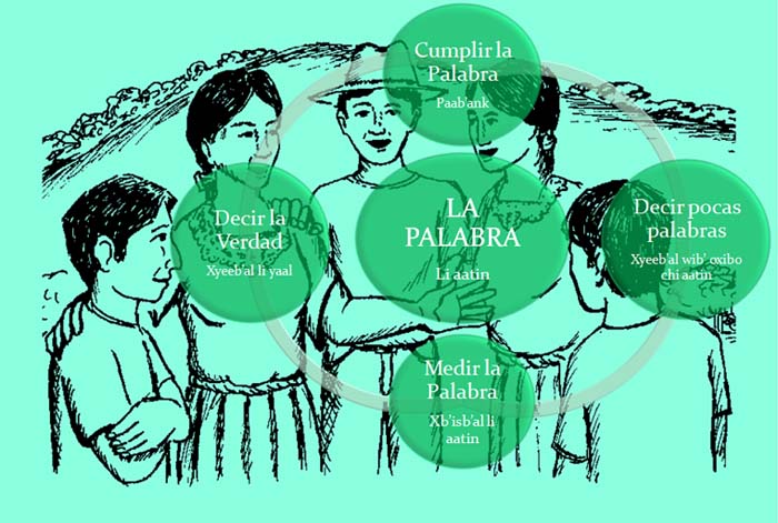 Land hat für die Q’eqchi’ in erster Linie einen sakralen Charakter. Land ist Vater und Mutter, Ernährer/Ernährerin. Zur Zeit der Gottkönige wurde den verstorbenen Herrschern vor deren in Stelen gehauenen Standbildern auf runden Steinblöcken Kopal Pom verbrannt. Im Jenseits hatten sie die Aufgabe, darüber zu wachen, dass die Oberwelt nicht in die Unterwelt hinunterbrach und die Sonne weiterhin ihre Kreise zog.Sie waren Lebensspender: Ernährer/Ernährerin. Nachdem sich die Bauern und Bäuerinnen von ihren Herrschern und Ausbeutern befreien konnten, erhielt das Land sakralen Charaktern. Inbegriff des Landes wurde der Berg (Q’awa Tzuultaq’a). Vor der Saat gehen die Q’eqchi’ auf die Berge und verbrennen Pom. Jeglicher Eingriff in die Erde (Säen, Hausbau, Brückenbau etc.) wird als notweniges Vergehen an der Sakralität des Bodens betrachtet. Diese Sakralität fordert unbedingten Respekt und entsprechende rituelle Handlungen, um mit den schützenden Geister des Q’awa Tzuultaq’a zu kommunizieren.Der beinahe besessene Wunsch vom eigenen Land kann als ein zum Zeitpunkt der Unterdrückung und Enteignung utopischer Traum bezeichnet werden – genauso utopisch wie der Traum von Freiheit zur Zeit der Gottkönige.